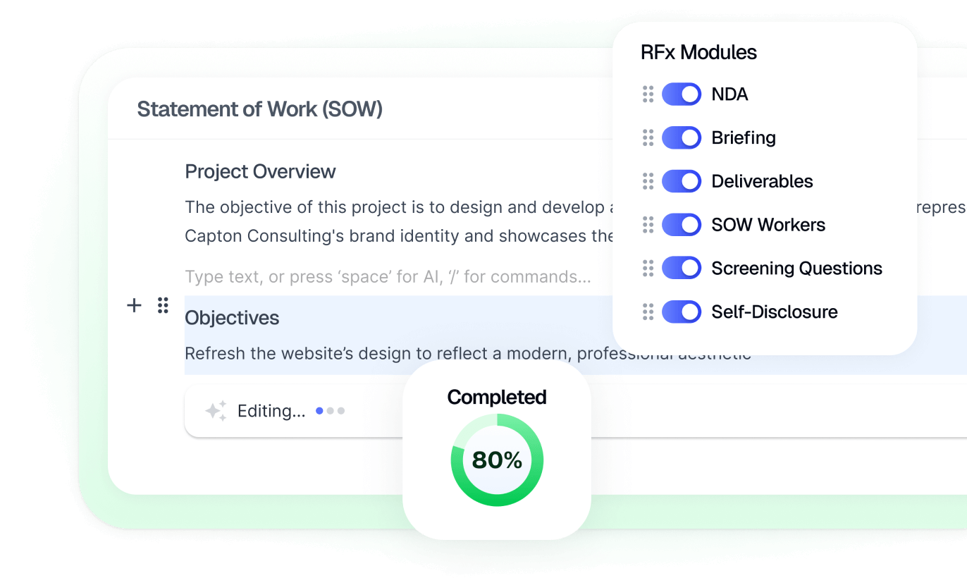Our native Statement of Work solution powers your entire source-to-pay journey. Handle complex multi-payment structures, seamlessly transition contractors within projects, run competitive RFx processes, and create SOWs with ease.
